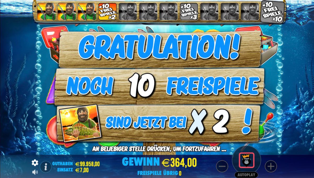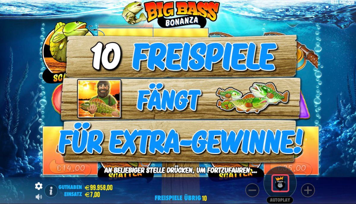 Kostenlos spielen auf unserer Website wird Ihnen schnell zeigen, was die absoluten Herzstücke dieses Games sind. In ganz Deutschland ist man begeistert von den Big Bass Bonanza Freispielen. Die Freispiel-Runde ist ein absolutes Highlight unter allen Slot Games in Deutschland, und das lässt sich auch durch das Spielprinzip erklären: Sobald man drei, vier oder fünf Scattersymbole erzielt hat, werden jeweils 10, 15 oder sogar 20 Freispiele ausgelöst. So viele Chancen bekommt man selten als Angler oder? Ein solcher angler ist es, der während der Freispiele auch erscheint und dafür sorgt, dass man die Geldwerte einsammeln kann, die man über die Fischsymbole auf den Walzen gelandet hat.